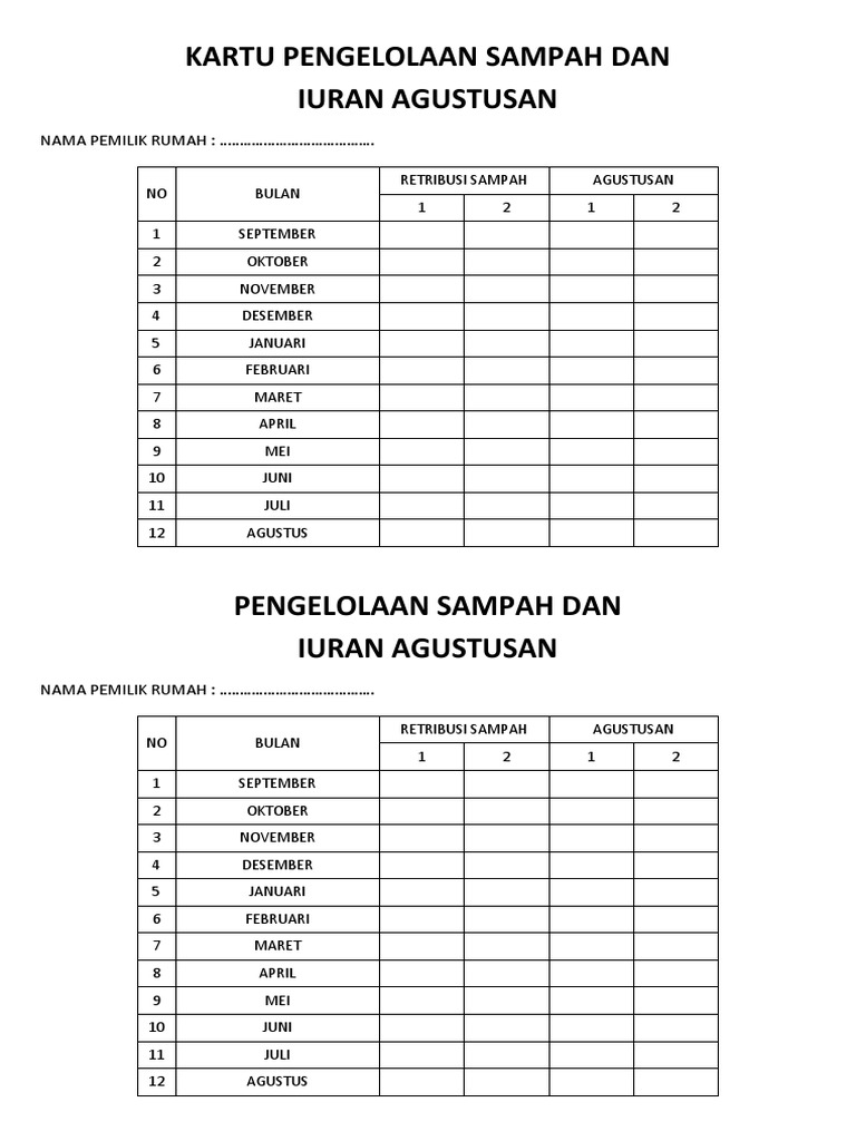Contoh Kartu Iuran Sampah