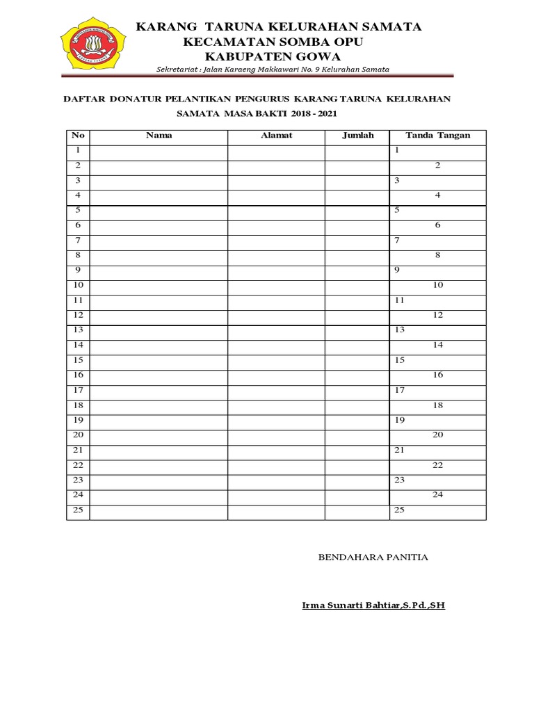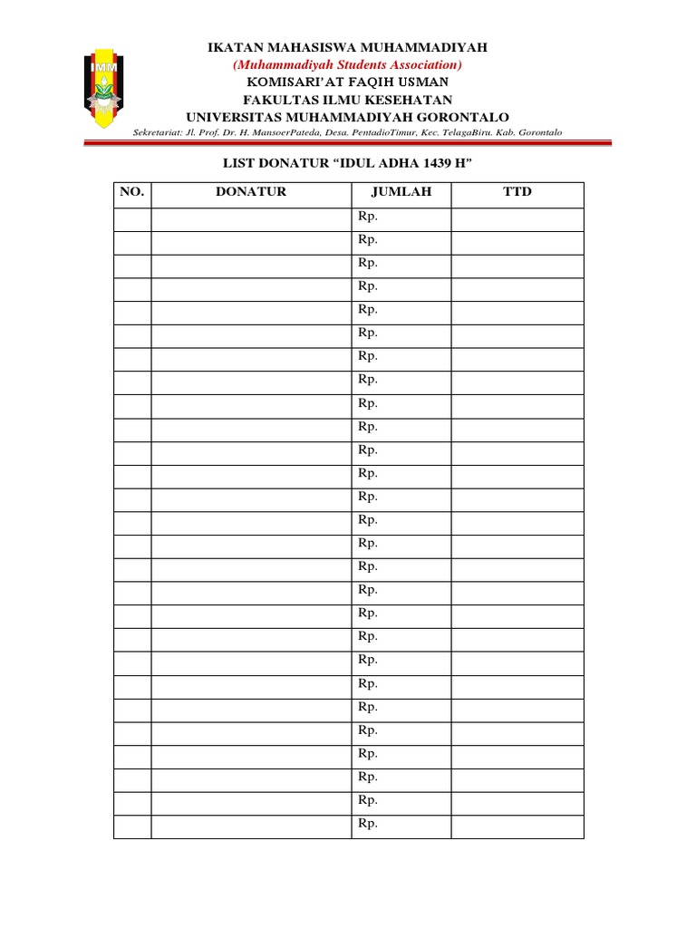 Contoh list donatur. Konsep Kesehatan Dalam Islam. PANITIA PELAKSANA REUNI AKBAR ALUMNI SMA NEGERI 4 GORONTALO TAHUN 2015 Nomor. Berdasarkan hal tersebut di atas DKM Al-Hidayah sangat mengharapkan dukungan moril dan materil berupa Uang InfaqSodaqoh zariah yang dinamakan Donatur TetapJiwa Kuat Masjid AlHidayah.