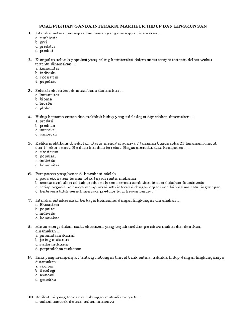 Soal Pilihan Ganda Interaksi Makhluk Hidup Dan Lingkungan