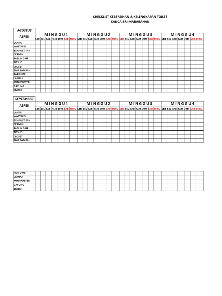 AGUSTUS 2016 TANGGAL KEGIATAN 1 2 3 4 5 6 7 8 9 10 11 12 13 14 15 16 17 18 19 20 21 22 23 24 25 26 27 28 29 30 31 Periksa kebersihan dan kerusakan secara visual Periksa fungsi toilet kran air pintu lampu Membersihkan toilet wastafel cermin Memberi pengharum ruangan Bersihkan pintu dan jendela toilet. Inilah contoh form ceklist kebersihan toilet dan hal lain yang berhubungan erat dengan contoh form ceklist kebersihan toilet serta aspek K3 secara umum di Indonesia. CHECK LIST KEBERSIHAN TOILE.