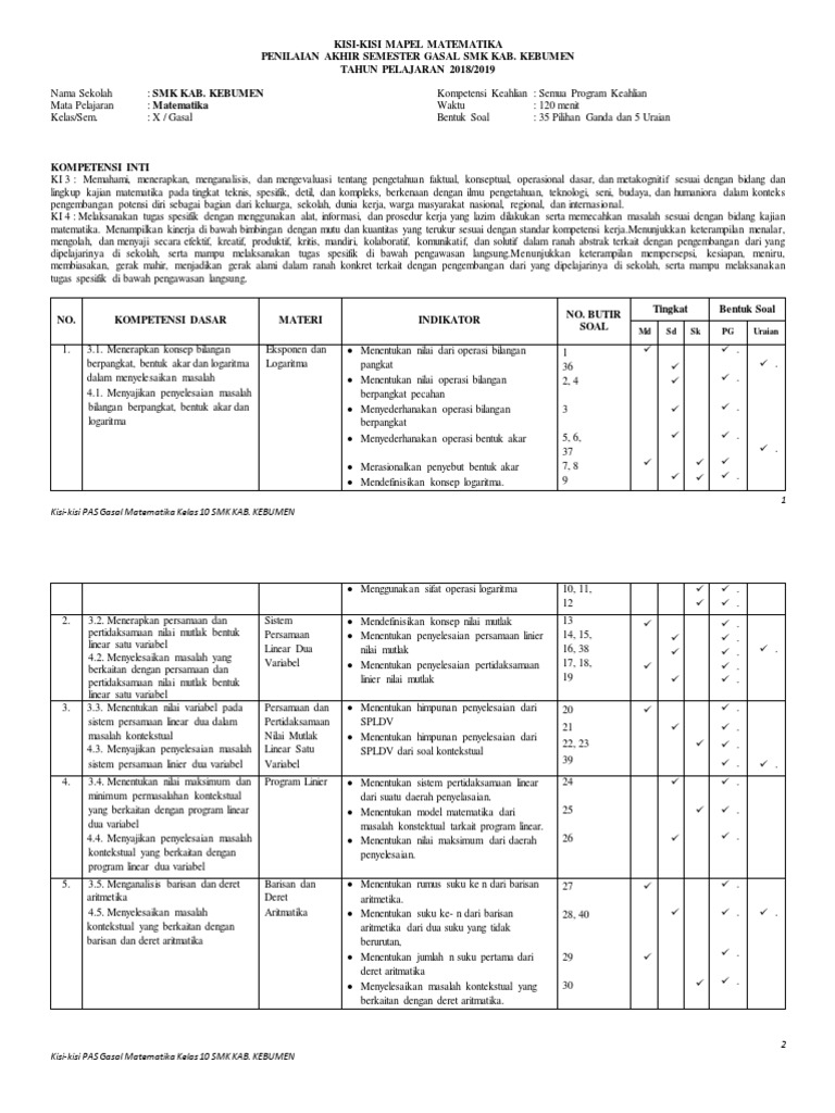 Kisi Kisi Pas Gasal Matematika Smk 2018 2019 Kelas X
