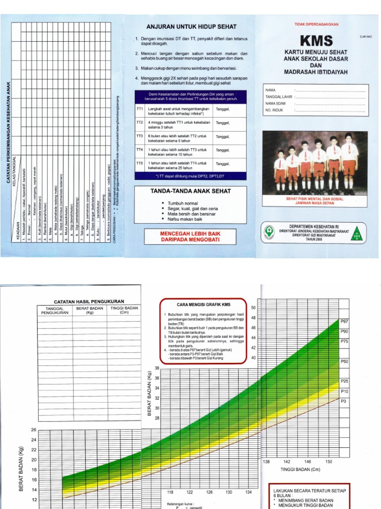 Pada kartu tersebut juga terdapat catatan perkembangan kesehatan anak dan imunisasi yang pernah diberikan serta anjuran untuk berperilaku sehat. Pustaka ini berupa KMS Kartu Menuju Sehat untuk siswa sekolah SMPMTS SMAMA dan SMK khusus untuk remaja laki-laki berisi identitas diri catatan hasil pengukuran grafik KMS cara mengisi grafik KMS catatan perkembangan kesehatan anak tanda-tanda anak sehat serta syarat remaja berkualitas. Cara Pengisian dan penggunaan KMS 1.