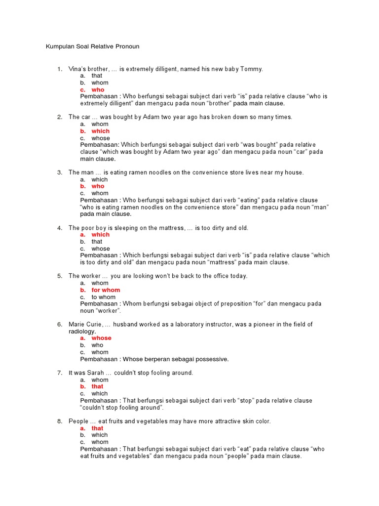 She was wearing a dress similar to the one that she wore when she first met her husband. Contoh Soal Relative Pronoun Pilihan Ganda dan Jawaban Relative Pronoun merupakan kata ganti yang berfungsi untuk menghubungkan kalimat yang menerangkan noun kata bendaKata benda disini bisa berupa manusia hewan atau barang. I wonder how to climb trees without.