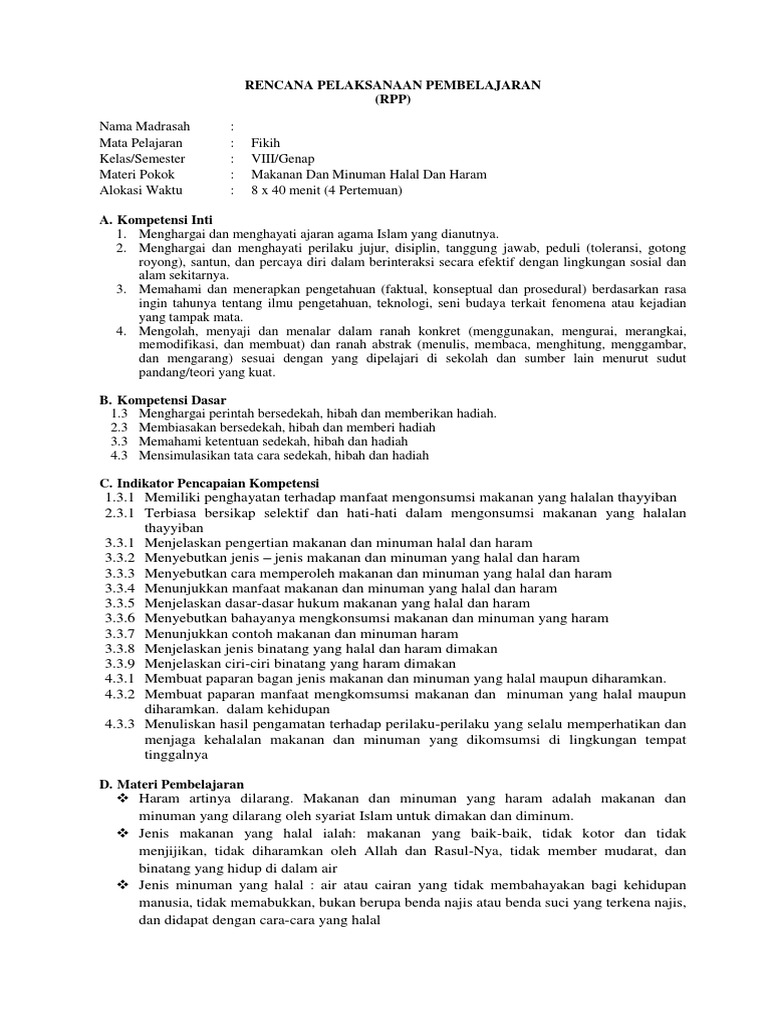 Rpp Fiqh Kelas 8 Makanan Dan Minuman Halal Docx