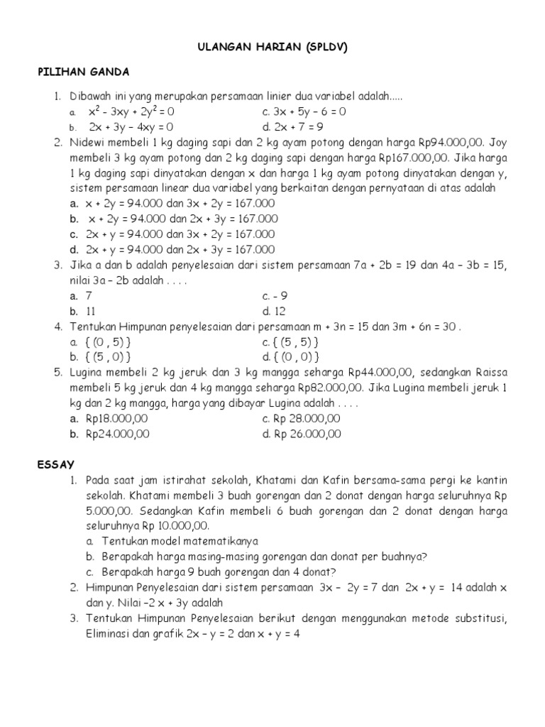 Soal Matematika Smp Sistem Persamaan Linier Dua Variabel Spldv Pdf