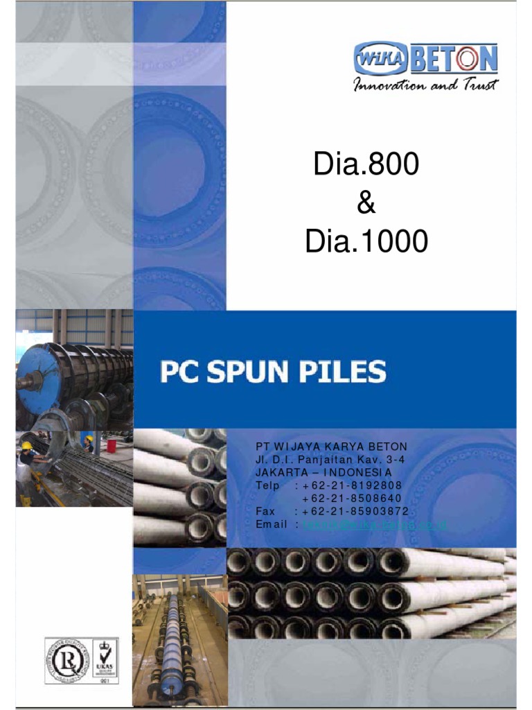 Jasa tiang pancang pracetak beton PC Spun Pile diameter 1200mm 1000mm 800mm yang ramah terhadap lingkungan khususnya untuk pondasi dengan diameter besar. Catalog Spun Pile WIKA BEton - Free download as PDF File pdf Text File txt or read online for free. The high level of concrete compactness as a result of centrifugal force causes Wika PC Spun Pile to have high durability and permeability to with stand certain environment condition.